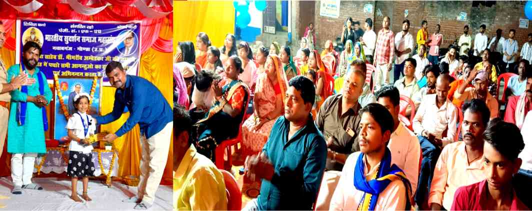 गोंडा।भारतीय सुदर्शन समाज महासंघ के तत्वाधान में विगत वर्ष की भांति इस वर्ष भी रविवार को दलित समाज के मसीहा,संविधान निर्माता,भारत रत्न,बाबा साहेब डॉ भीमराव अंबेडकर की 133वीं जयंती नवाबगंज नगर के मो.पोख्तादरवाजा (झिलिया चौराहा) में बहुत ही धूमधाम से मनाई गयी जिसमें मुख्य अतिथि संगठन सदस्य शनि दयाल के रूप मे संगठन के पदाधिकारियों व सम्मानित बंधुओ द्वारा मण्डल अध्यक्ष समेत अन्य पदाधिकारी गण को कार्यक्रम मे दीप प्रज्वलित एवं बाबा साहेब के चित्र पर माल्यार्पण कर कार्यक्रम का शुभारंभ कराया गया तथा बच्चों द्वारा विभिन्न कार्यक्रमों का आयोजन हुआ। मुख्य अतिथि ने बाबा साहब के काम एवं समाज के लिए किये गये योजनाओं पर प्रकाश डाला गया। मौके पर दूर दराज से आए हुए वक्ताओं ने बाबा साहेब के जीवन संघर्षों पर प्रकाश डाला उक्त कार्यक्रम में सर्व समाज के बन्धुगणों की उपस्थिति रही एवं प्रशासन से हमारे कस्बा इंचार्ज मनीष कुमार एवं उनके टीम का विषेश सहयोग रहाइस कार्यक्रम दौरान बच्चों को संत्वाना पुरस्कार देकर सम्मानित किया गया ।इस दौरान क्षेत्र के परसहना सहित विभिन्न स्थानों पर मनाया गया। मौके पर कांग्रेस जिला उपाध्यक्ष अरुण गौतम आनंद कोरी बब्बन यादव प्रेमप्रकाश भारती सुरेश कुमार संजय कुमार सहित तमाम लोग मौजूद रहे ।